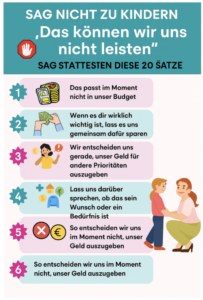 „Nein, das können wir uns nicht leisten.“ – Warum wir diesen Satz streichen sollten (und was wir stattdessen sagen können) Kennst du diesen Moment?Dein Kind fragt dich: „Mama, können wir das neue Fahrrad kaufen?“ oder „Bekomme ich einen eigenen Laptop?“Und fast automatisch kommt die Antwort:„Nein, das können wir uns nicht leisten.“ Aber genau da liegt […]