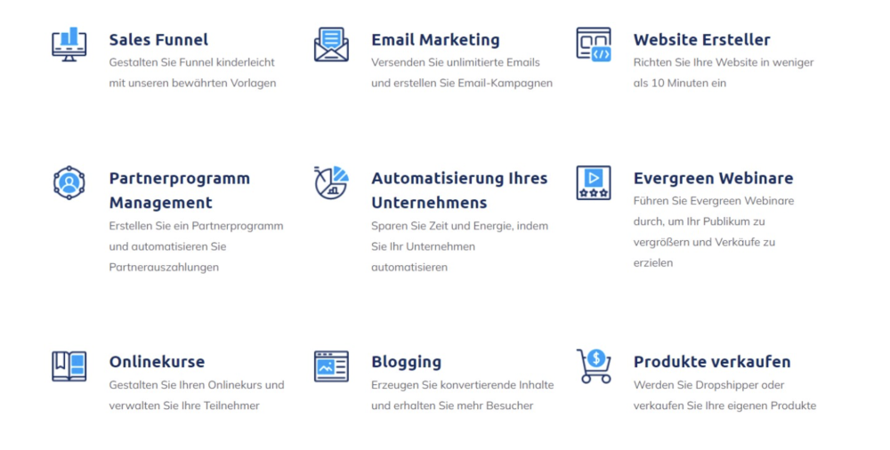 - Du brauchst keine zusätzlichen Plugins oder Tools – alles ist direkt integriert: Shop, Kursplattform, E-Mail-Marketing, Affiliate-Optionen usw.